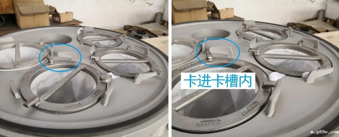 • 放上过滤袋卡环(左图),顺时针压紧滤袋卡环(右图),用扳手等工具进一步卡紧卡环。